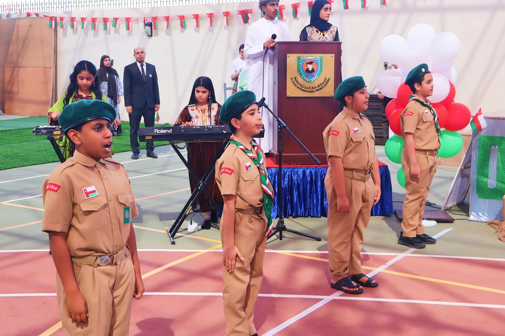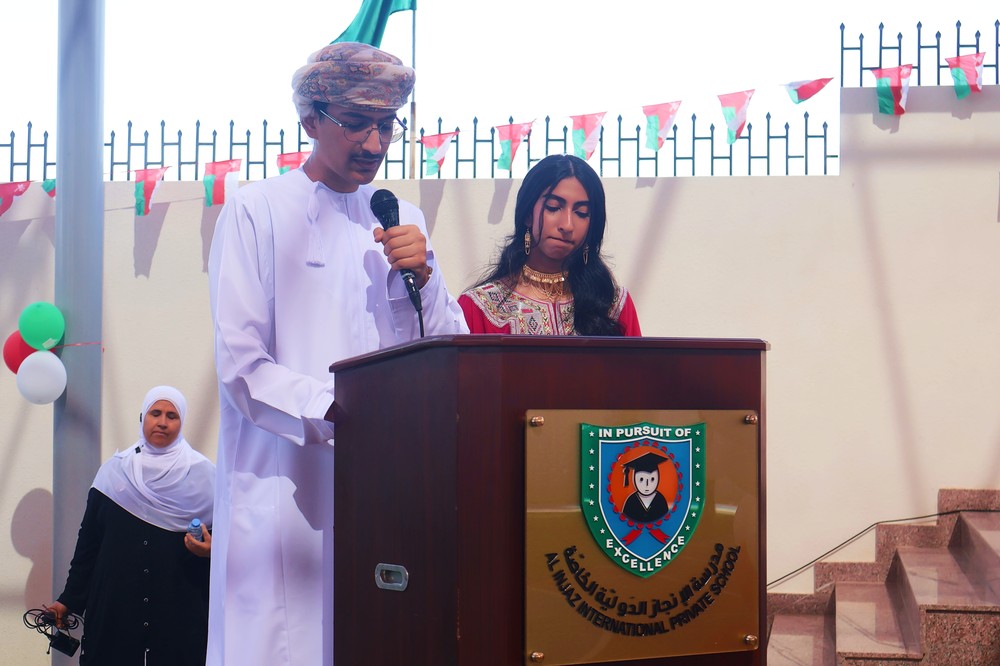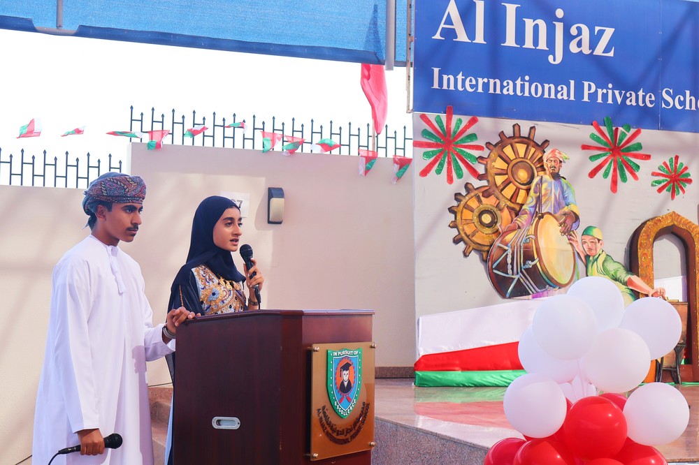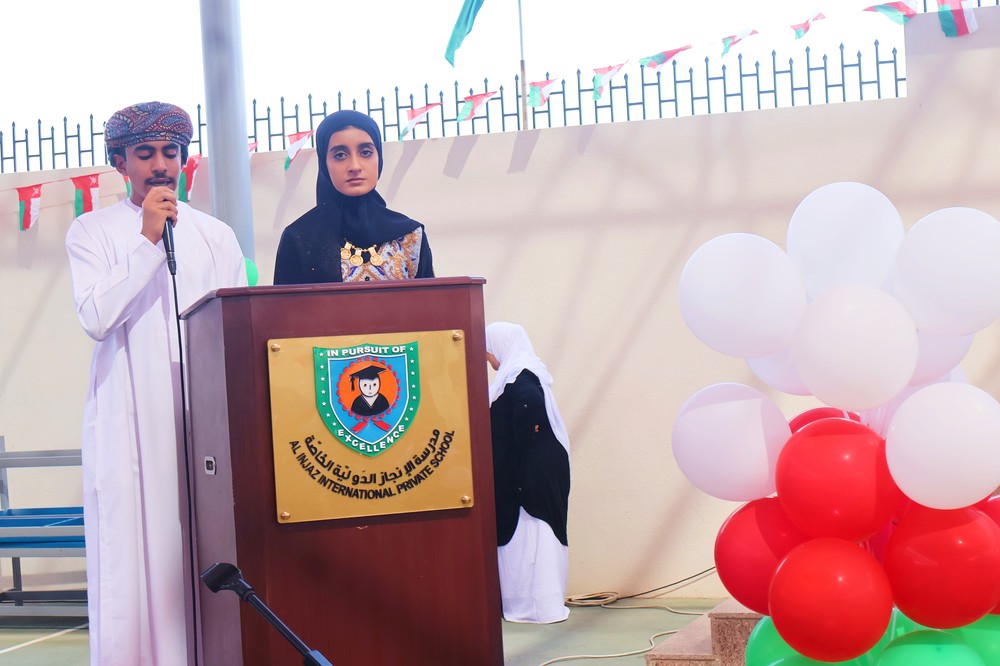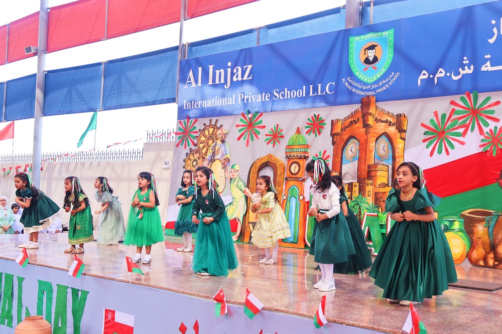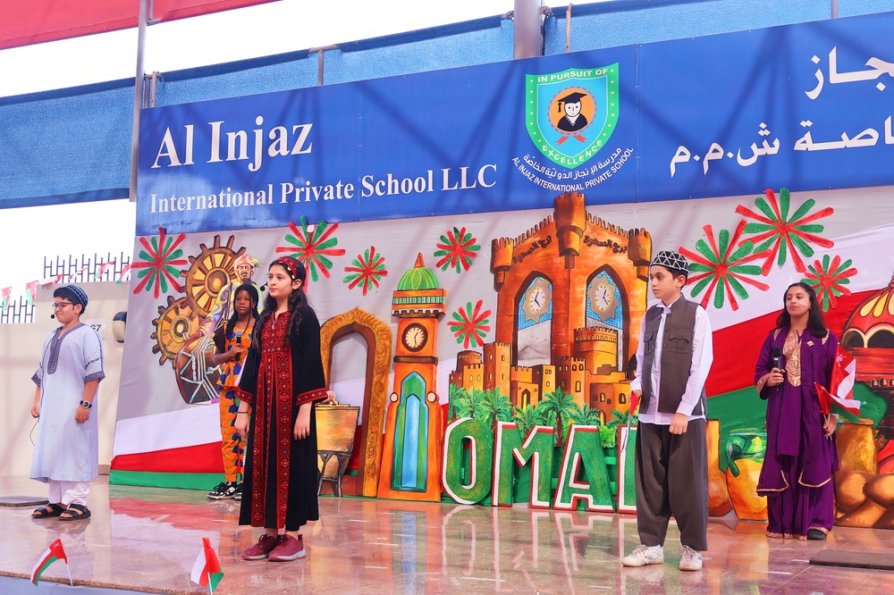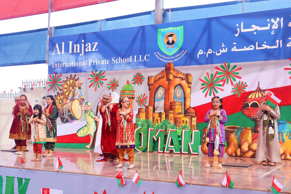 The spirit of unity, pride, and cultural richness came alive at Al Injaz International Private School as students, staff, and parents gathered to mark the Oman National Day Celebration. Held in the school courtyard, the event was a vibrant display of patriotism, tradition, and talent, as the entire school community came together to honor the Sultanate’s glorious past and promising future.