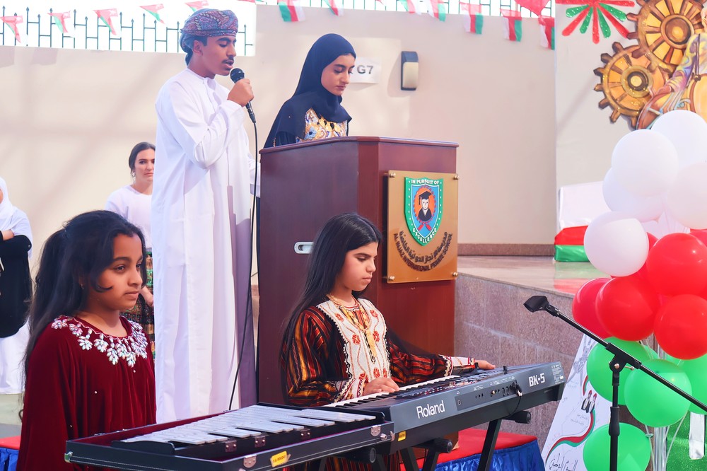 The celebration began with a special school assembly where students from various grades performed patriotic songs that echoed through the school. These heartfelt melodies, sung with sincerity and reverence, paid tribute to Oman’s peace, leadership, and unity under the wise guidance of His Majesty Sultan Haitham bin Tariq.